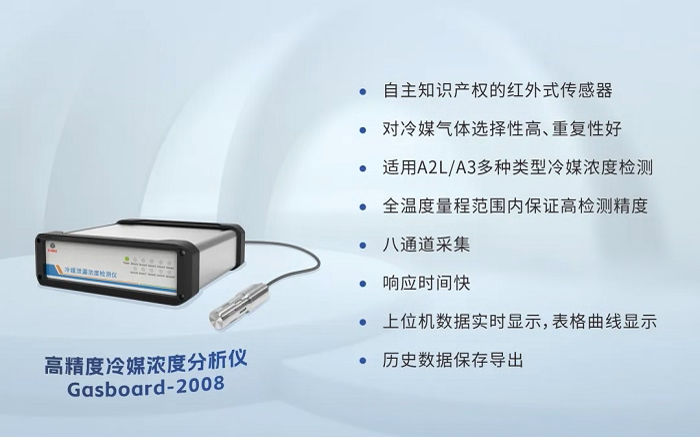 冷媒浓度探测装置是巅峰国际自主研发的高精度冷媒浓度分析仪,采用红外传感器,共有8个检测通道,可检测多种A2L/A3冷媒,并顺利获得上位机进行实时数据显示。