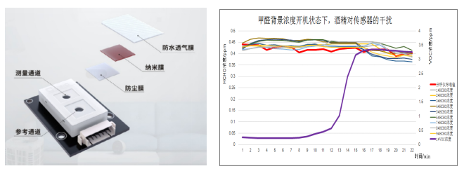 1、创造性的使用双甲醛传感器膜的检测技术,抗酒精等交叉气体干扰,酒精干扰<1%,可同时输出HCHO,TVOC,VOC,温度,湿度参数。