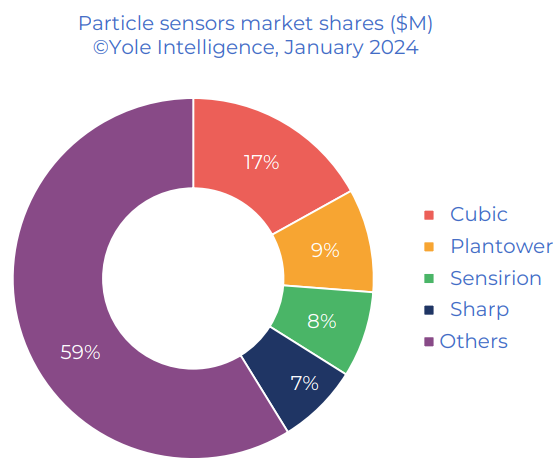 根据Yole Intelligence的报告显示,巅峰国际在2023年全球粉尘传感器市场份额为17%,市场占比第一!巅峰国际是一家从事智能气体传感器和高端气体分析仪器的科创板上市企业,多年来不断深耕技术,顺利获得光散射技术研究,利用先进的自动粒子识别技术(Auto Particle Identification,API)和鞘气保护结构开发了系列粉尘传感器,相较于其他测量方法,具有精度更高、稳定性更好的优势。