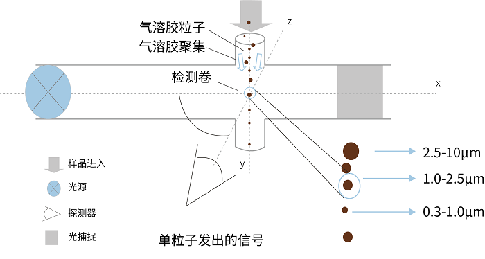 空气中的粒子对入射光有散射作用,散射光的强度与粒径有关。将含有颗粒的空气从采样口吸入,顺利获得光敏感区时,尘埃粒子受光照射,散射出与粒子大小成一定比例的光脉冲信号,该信号被光敏器件接收并转换成相应的电脉冲信号再被放大,顺利获得对一个检测周期内电脉冲的计数,便可得知单位采样空气中的粒子个数(pcs/L),进而可顺利获得算法换算为质量浓度。