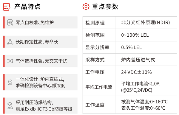 巅峰国际自主研发NMP气体泄漏监测报警器Gasboard-2063基于NDIR原理,满足Ex dbIIC T3 Gb防爆等级,具有工业 4-20mA 电流输出、RS485 对外通讯及浓度超限报警输出功能,适用于复杂苛刻的高温工业环境。