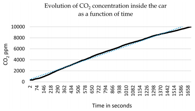 研究表明,成年人静息状态下,每分钟消耗约0.3L O2,同时呼出约0.25L CO2。当一位成年人坐在内部容积3.5 m³且车窗关闭内循环开启的轿车中,氧气浓度从21%(正常值)以每小时约0.4%的速率下降,同时CO2浓度也由0.04%(正常值)以每小时约0.34%的速率上升。3小时后,CO2浓度迅速上升至1.02%,超过危险临界值1%,此时氧气的浓度为19.8%,仍高于氧气浓度的危险临界值19.5%[2,3]